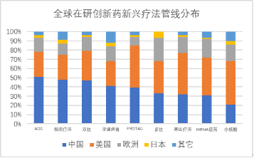 全球在研新兴疗法涵盖基因疗法、细胞疗法、RNA疗法、ADC、双/多抗、核药等前沿技术,处于爆发式增长期,基因疗法、RNA疗法、ADC、双抗等技术路线成为主力,美国占全球新兴疗法管线数量超过40%,在基因/细胞疗法、mRNA、ADC等领域持续领先。中国新兴疗法管线数量大幅增加,其中ADC、双抗、细胞疗法为主要增长点,目前中国已成为仅次于美国的全球第二大新兴疗法研发国。